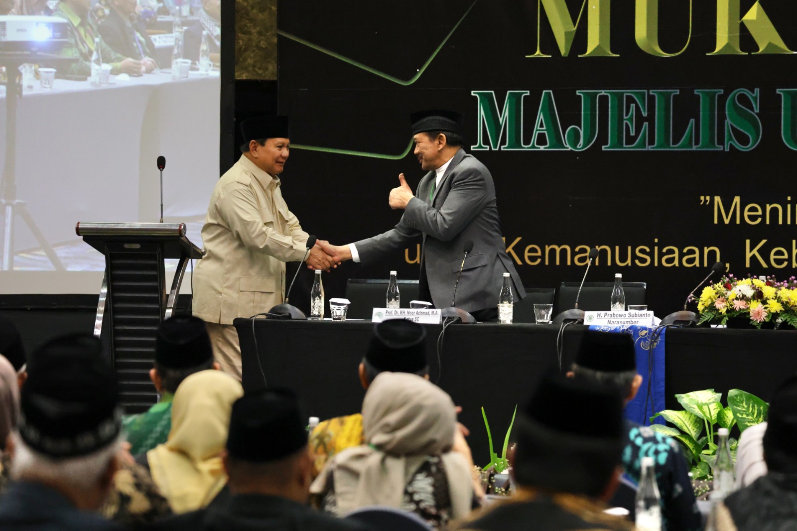 “Kiai itu mengatakan kepada saya, sudah mas Bowo nggak usah mikir lagi kembali ke tentara. Mas Bowo jadi pengusaha saja,” ujar Prabowo, disambut riuh tawa para ulama yang hadir.