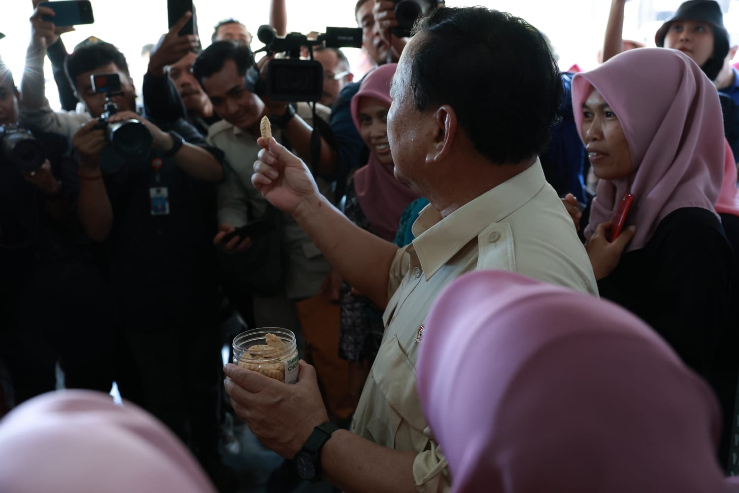 “Pak, ini dari Desa Prima, Gunung Kidul. Thiwul Chokot,” ujar seorang emak-emak sembari memberikan satu toples Thiwul Chokot kepada Prabowo.