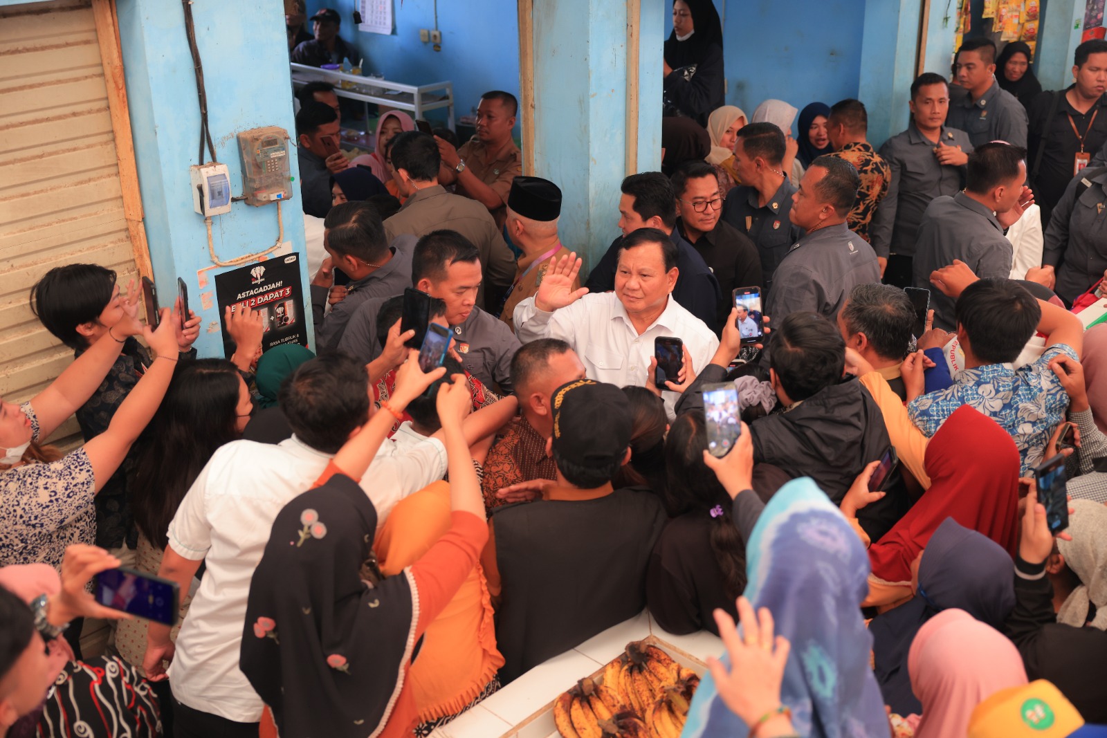 Para pedagang dan warga sekitar pun berebutan dan berhimpitan ingin mendapatkan kesempatan berfoto dan bersalaman.