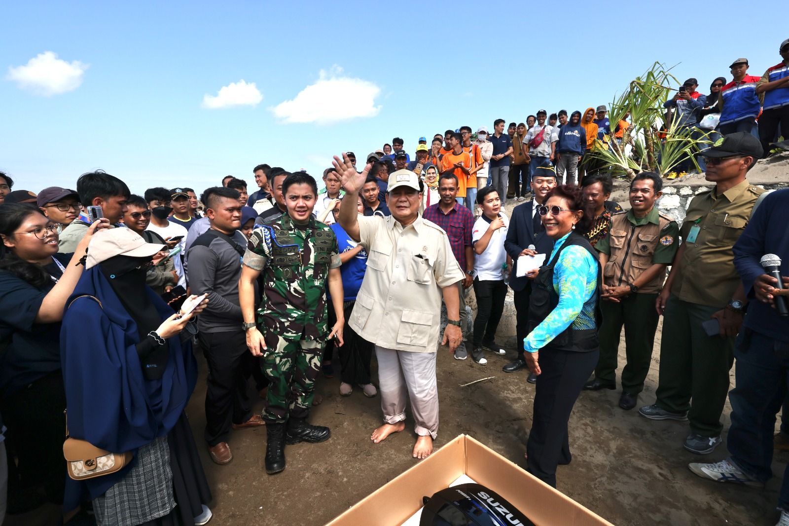 Dengan mengenakan seragam coklat safari dengan topi krem, Prabowo didampingi Susi bersalaman dengan warga yang menyambut kedatangannya.