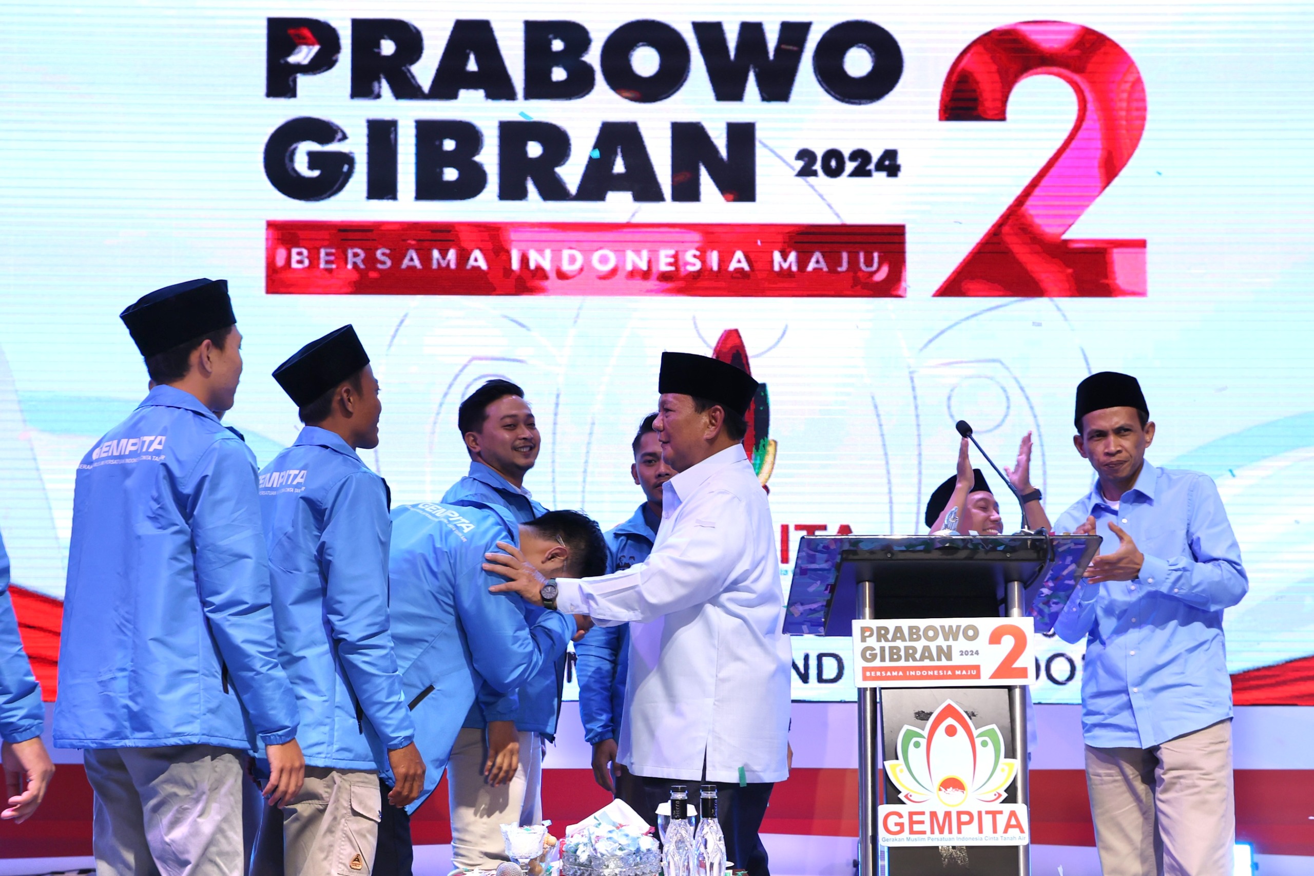 KS, BANDUNG – Calon presiden nomor urut 2, Prabowo Subianto menghadiri acara deklarasi nasional Gerakan Muslim Persatuan Indonesia Cinta Tanah Air (Gempita) di Grand Sudirman Ballroom, Bandung, Jawa Barat, Rabu (27/12).