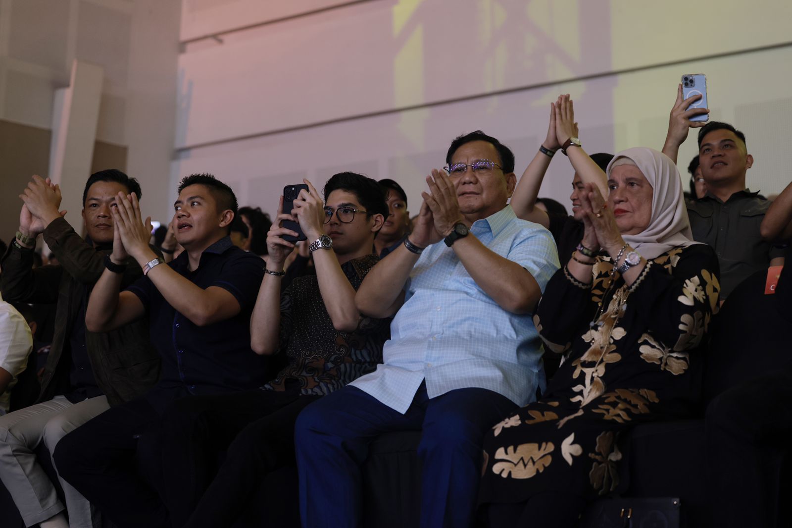 Prabowo yang berada di tengah-tengah penonton pun melambaikan tangan. Ia duduk di samping Al.