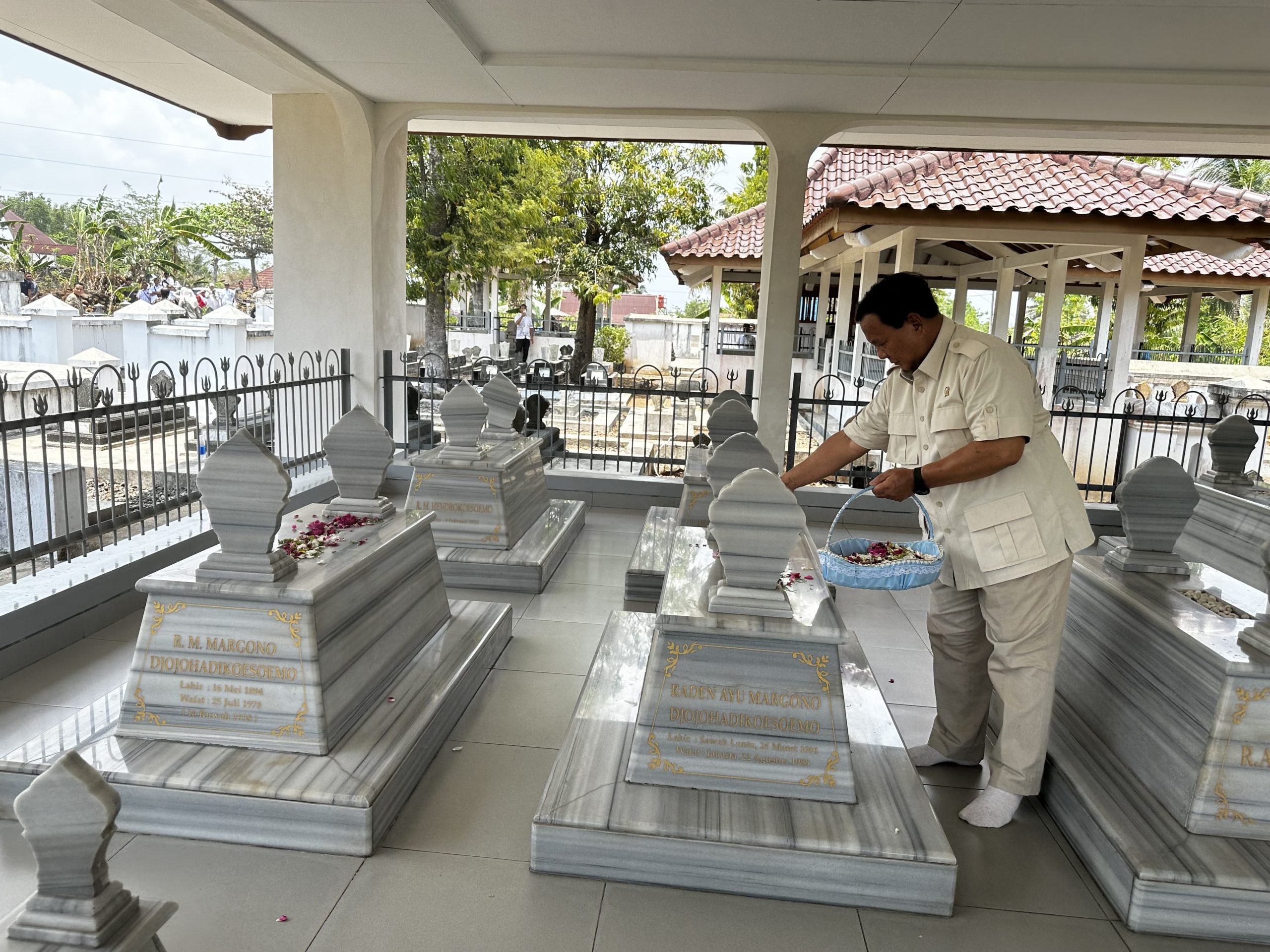 “Karena berada di deket sini, kalau nggak mampir nggak nyekar takut kualat. Ini makam Eyang Kakung saya, Kakek saya dengan Eyang Putri saya dan keluarga-keluarganya memang aslinya dari daerah sini itu dari Pak Margono,” kata Prabowo.