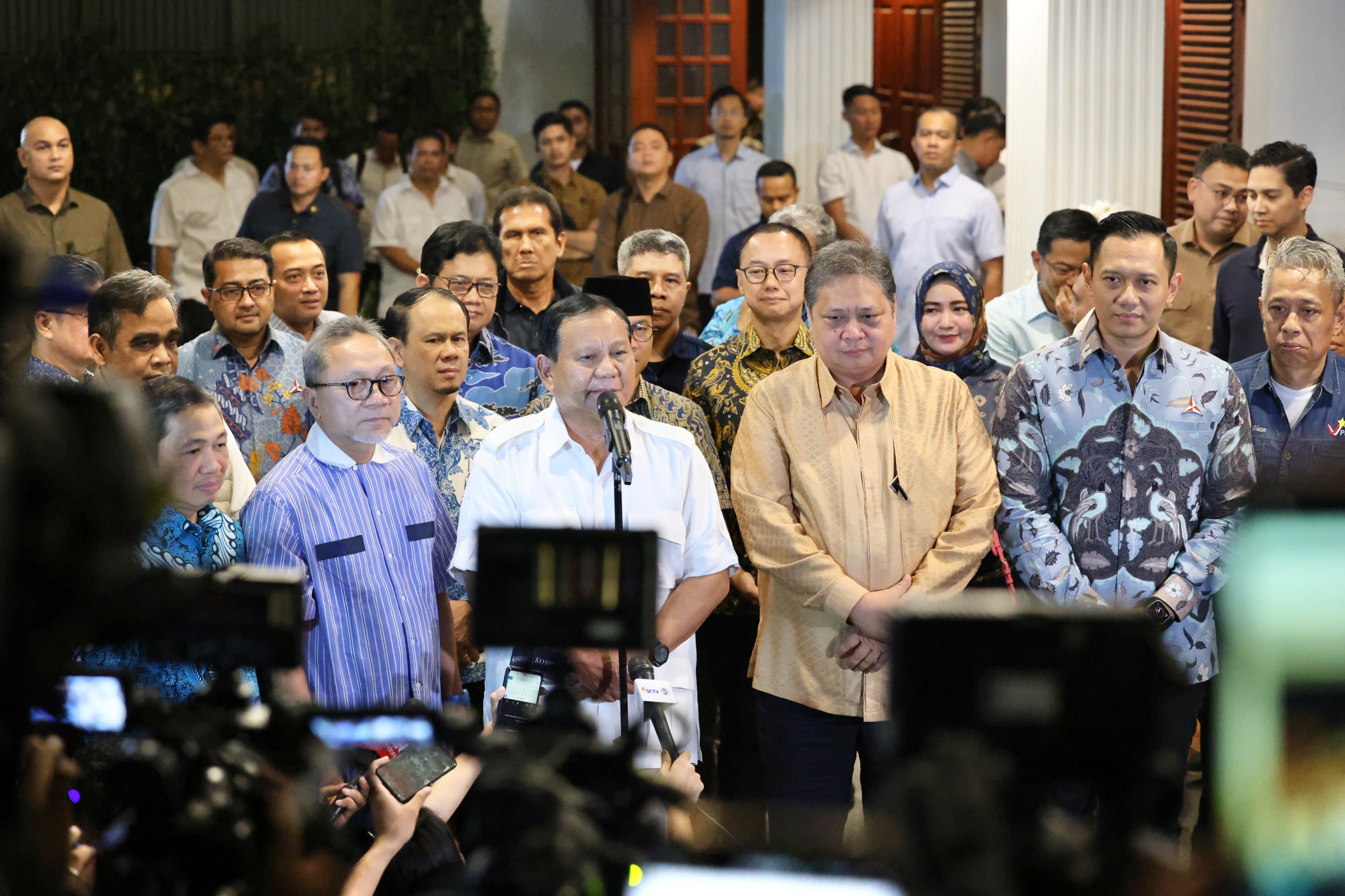 Prabowo pada kesempatan itu didampingi para ketum partai koalisi, termasuk di antaranya Airlangga Hartarto (Partai Golkar); Zulkifli Hasan (PAN); Agus Harimurti Yudhoyono (Partai Demokrat); Yusril Ihza Mahendra (PBB); Anis Matta (Partai Gelora). (ris)