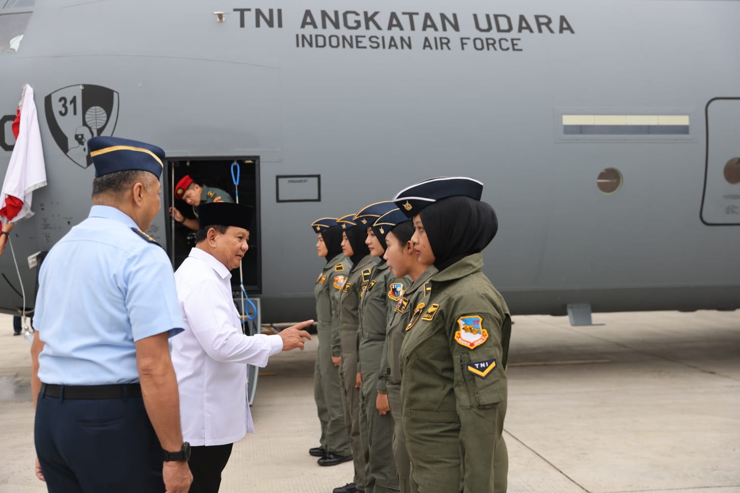 Di awal sebelum penyerahan secara simbolis Pesawat C-130J Super Hercules, Prabowo melakukan prosesi peresmian dengan pelepasan tirai logo Skadron Udara 31, pecah kendi dan penyiraman air kembang yang didampingi, Kasau, Kasatgas Udara, Sekjen Kemhan, Kasum TNI, Wakasau, Dankodiklat AU serta Irjen Kemhan dan Kabaranahan Kemhan.