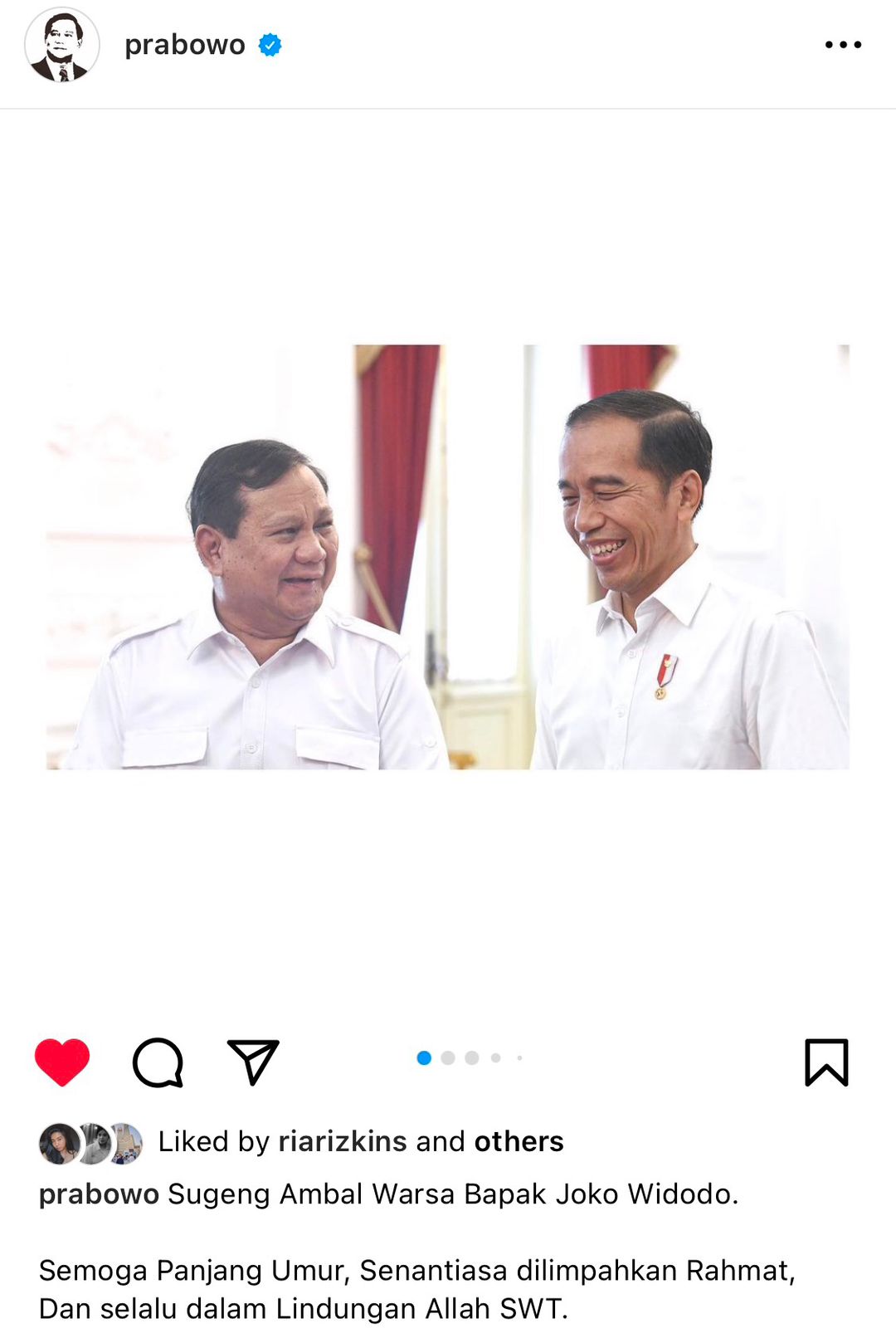 Hari ini Prabowo mengunggah enam buah foto dalam akun Instagram @prabowo seraya menulis ucapan, “Sugeng Ambal Warsa Bapak Joko Widodo, semoga panjang umur, senantiasa dilimpahkan rahmat, dan selalu dalam lindungan Allah SWT.” (ris)