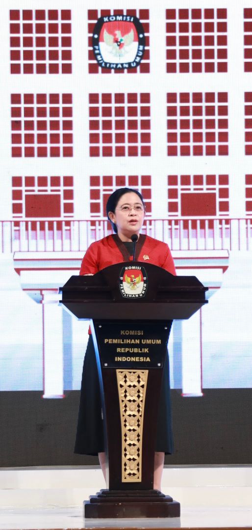 “Pemilu di Indonesia tidak boleh kita anggap sebagai rutinitas 5 tahunan saja. Pemilu memiliki kedudukan yang sangat strategis dalam kehidupan berdemokrasi di Indonesia,” ujar Puan yang mengenakan blus merah hitam.