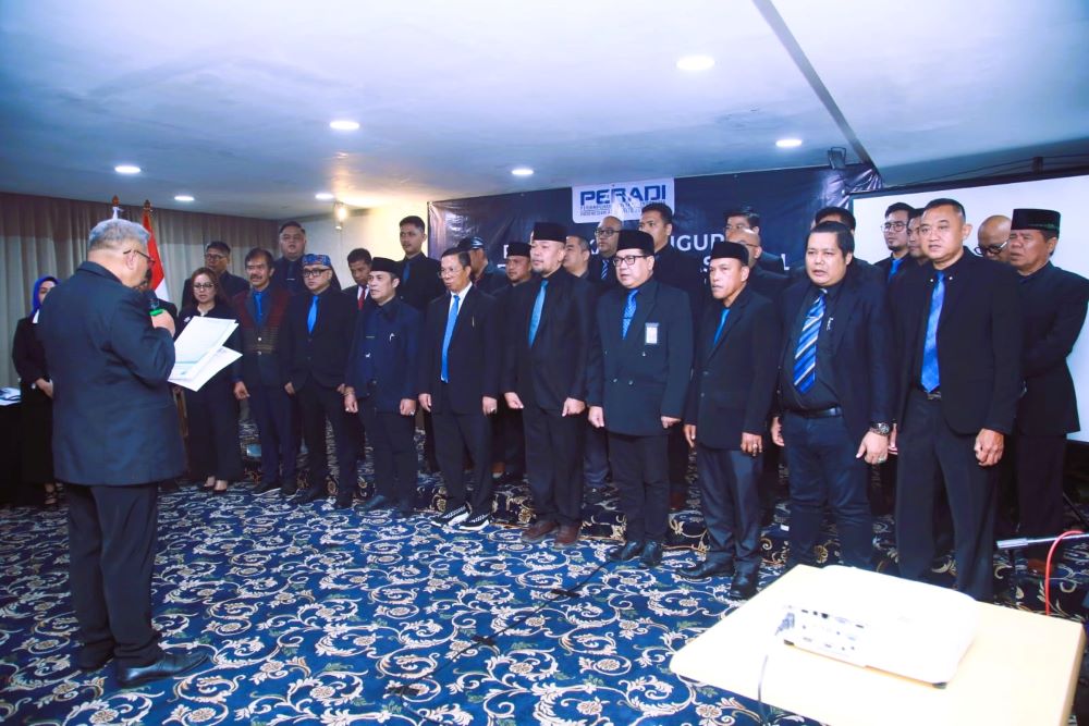 Para pengurus DPN PERADI masa bhakti 2026-2031 mengucapkan sumpah dan janji setia pada Negara Kesatuan Republik Indonesia (NKRI), Pancasila, UUD 1945, soliditas organisasi dan menjalankan etika profesi.