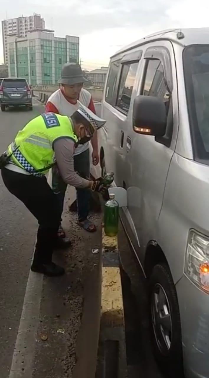 Kbo Satlantas Jakarta Barat AKP Sudarmo sigap memberikan bantuan membelikan dan mengisikan bensin sebuah kendaraan mini bus Daihatsu grand max B 2055 UKK mengalami mogok akibat kehabisan bensin.