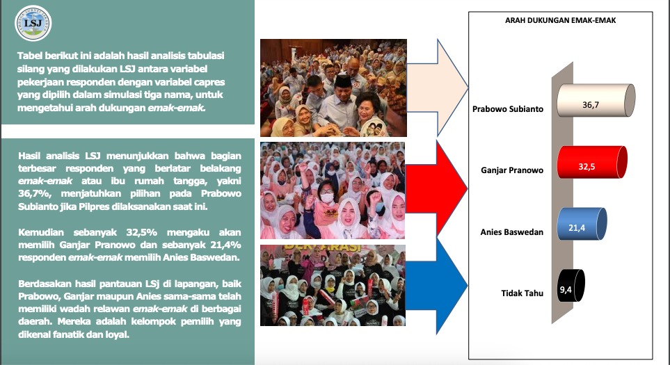 Hasil survei LSJ yang bertajuk “Dinamika Elektabilitas dan Arah Dukungan Kalangan ASN dan Emak-Emak Jelang Pemilihan Presiden 2024” periode 20-29 Juni 2023 ini melibatkan sebanyak 1.200 responden.