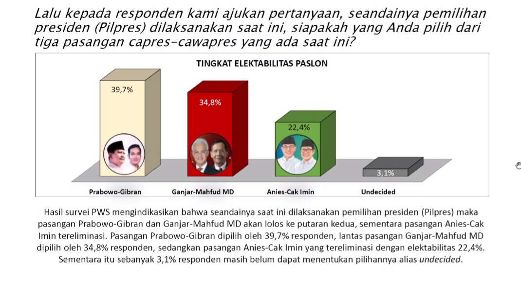 “Pertama-tama ketika PWS mengajukan pertanyaan kepada responden, seandainya Pemilu dilaksanakan saat ini dan diikuti tiga pasangan (Prabowo-Gibran, Ganjar-Mahfud dan Anies-Cak Imin) pasangan manakah yang dipilih, ternyata 39,7% responden dengan spontan mengaku akan memilih Prabowo-Gibran. Kemudian pasangan Ganjar-Mahfud dipilih oleh 34,8% responden dan Anies-Cak Imin hanya dipilih oleh 22,4% responden. Sementara 3,1% responden mengaku belum dapat menentukan pilihan (undecided),” paparnya