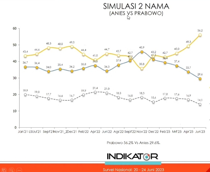 Hasil tersebut terungkap dalam temuan survei Indikator Politik Indonesia yang dilakukan pada periode 20-24 Juni 2023 dengan tema “Kepemimpinan Nasional dan Dinamika Elektoral Jelang 2024 di Mata Generasi Muda”.