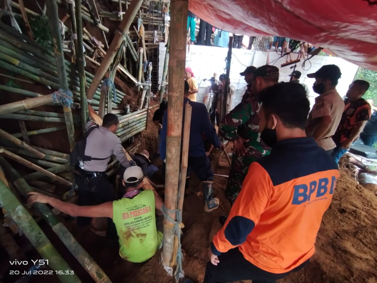 Tim gabungan dari Badan Penanggulangan Bencana Daerah (BPBD) Kabupaten Sukabumi dan unsur TNI-Polri, Pemadam Kebakaran, instansi terkait serta masyarakat setempat bergotong-royong mengevakuasi dua korban yang tertimbun material longsoran dengan menggunakan alat seadanya.