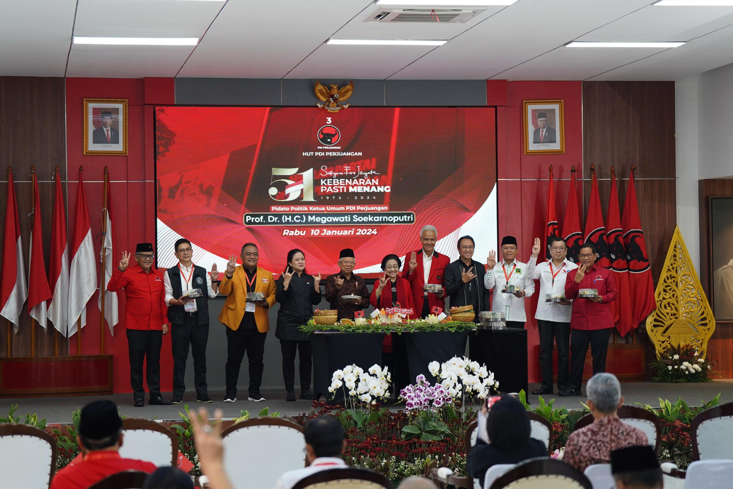 KS, JAKARTA – Para Ketua Umum Partai Persatuan Pembangunan (PPP), Partai Persatuan Indonesia (Perindo), dan Hati Nurani Rakyat (Hanura) mengucapkan Hari Ulang Tahun yang ke-51 untuk PDI Perjuangan. Diketahui, tema HUT kali ini PDI Perjuangan yakni ‘Satyam Eva Jayate, Kebenaran Pasti Menang’.