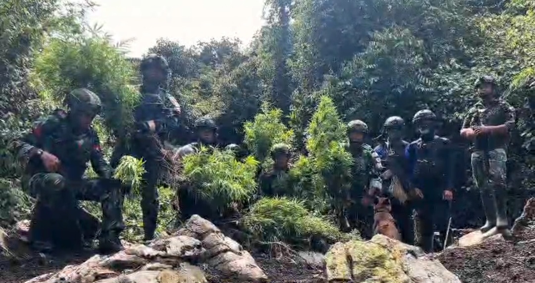 KS, PEGUNUNGAN BINTANG — Patroli Keamanan oleh Satgas Yonif 751/VJS dan Satgas Intel lainnya dipimpin langsung oleh Dansatgas Yonif 751/VJS ke arah Hutan Dusun Ngutok, Kampung Kabiding, Distrik Oksibil menghasilkan penemuan ladang ganja dengan jumlah Pohon yang tertanam sekitar 740 batang.(Selasa,21/10/2025)