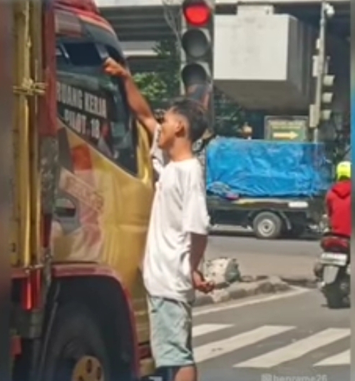 Dalam rekaman tersebut nampak pak ogah sedang memaksa untuk meminta sejumlah uang kepada sopir truk yang sedang berhenti di lampu merah Jembatan Tiga.