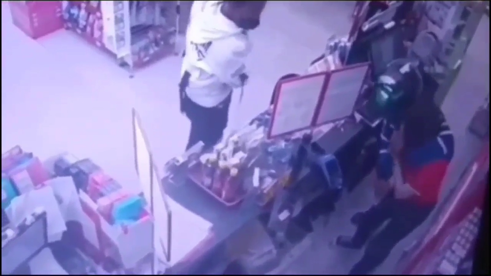 Dalam video yang beredar, terlihat [ria berpakaian hoodie putih berdiri di depan kasir, sementara rekannya menghampiri petugas yang diketahui merupakan wanita, dan memitingnya hingga tak bisa meronta dan menggiringnya ke laci kasir untuk mengambil uang.