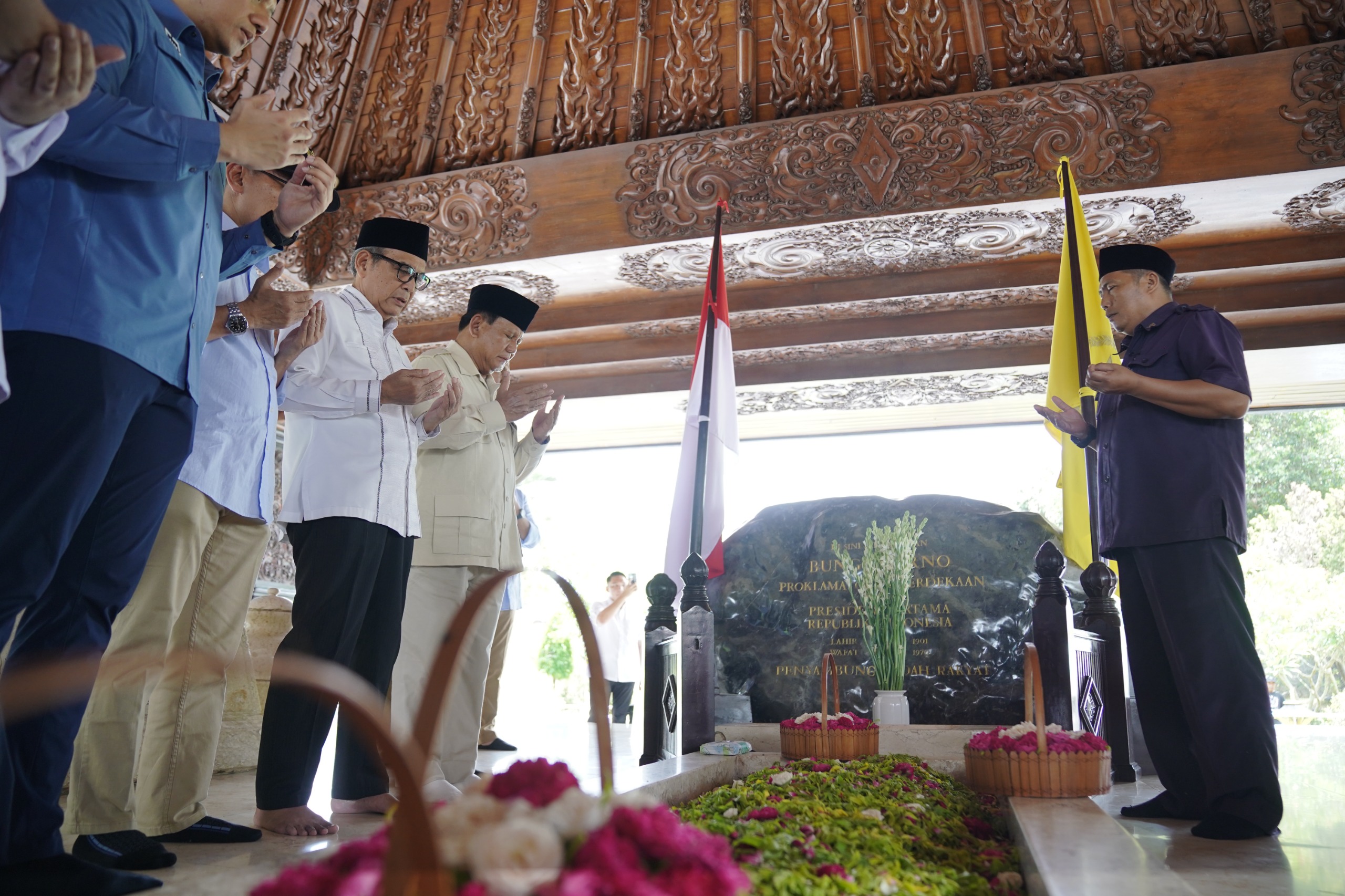 Ia lalu bersama rombongan menuju area makam dan berdoa dengan khidmat di depan nisan. Setelah berdoa selama sekitar 15 menit, Prabowo membungkuk dan menabur bunga ke makam Soekarno dan kedua orangtuanya, R. Soekarni Sosrodihardjo dan Ny. Ida Aju Njoman Rai.